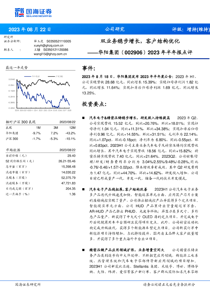 国海证券:华阳集团(002906)-2023年半年报点评:双业务稳步增长,客户结构优化.pdf