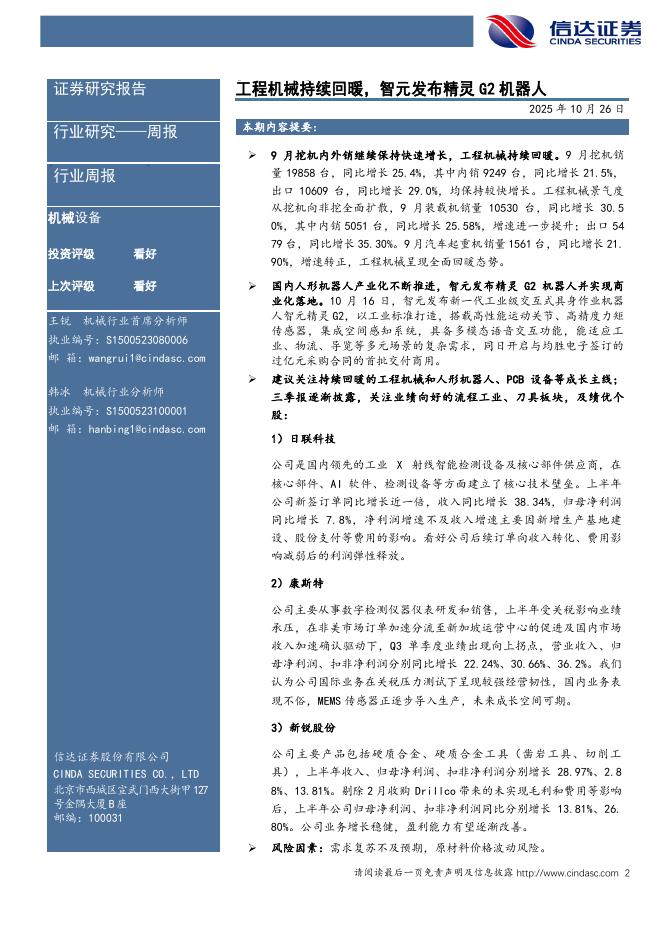 信达证券:机械设备行业周报:工程机械持续回暖,智元发布精灵G2机器人.pdf