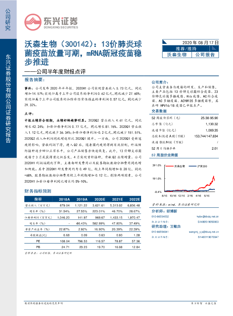 东兴证券:沃森生物(300142)-公司半年度财报点评:13价肺炎球菌疫苗放量可期,mRNA新冠疫苗稳步推进.pdf