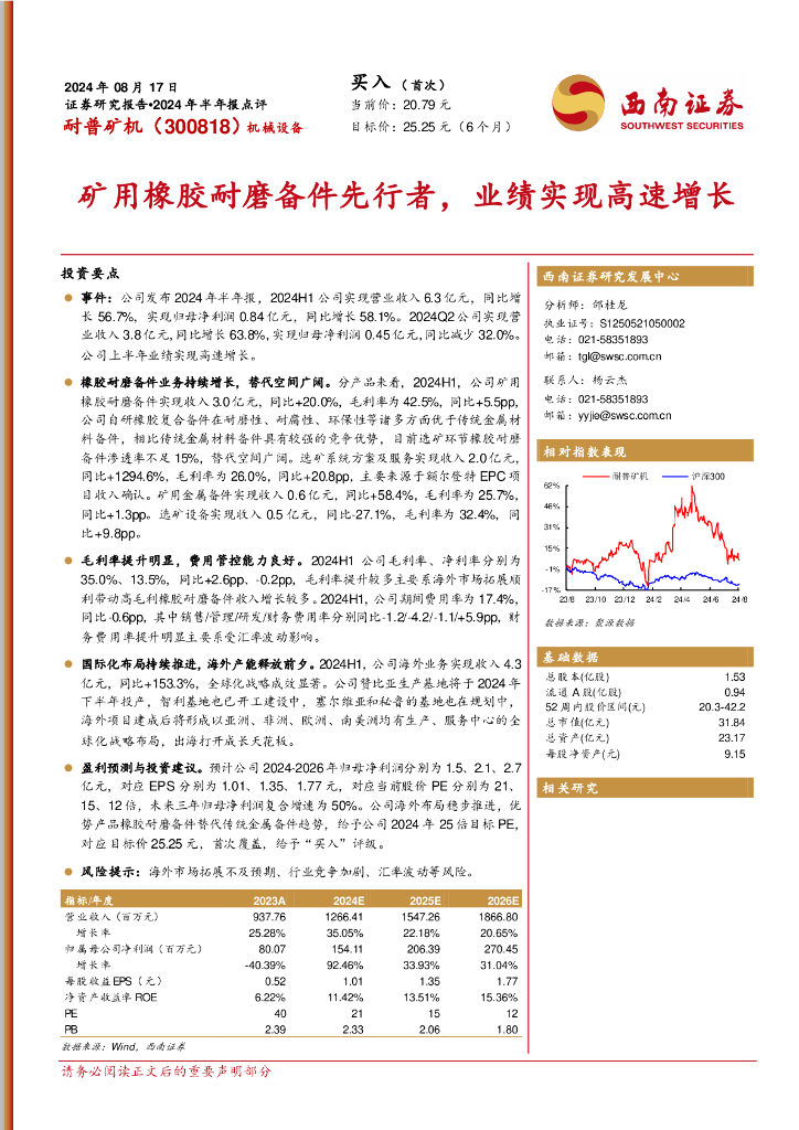 西南证券:耐普矿机(300818)-2024年半年报点评:矿用橡胶耐磨备件先行者,业绩实现高速增长.pdf