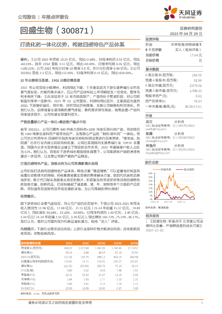 天风证券:回盛生物(300871)-打造化药一体化优势,构建回盛特色产品体系.pdf