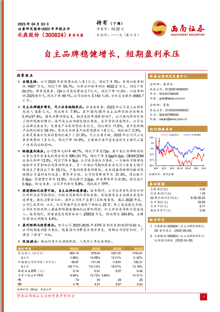 西南证券:北鼎股份(300824)-自主品牌稳健增长,短期盈利承压.pdf