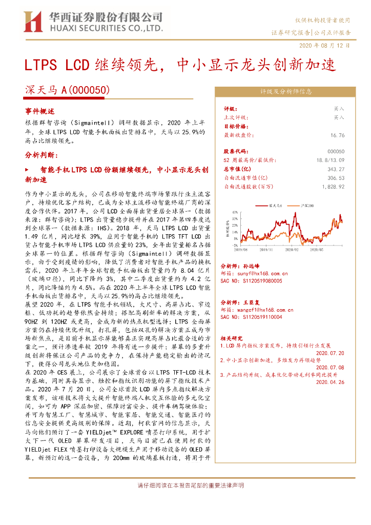 华西证券:深天马A(000050)-LTPS LCD继续领先,中小显示龙头创新加速.pdf