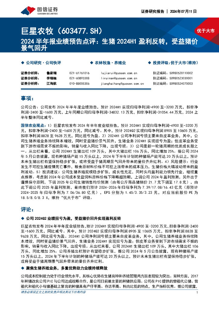 国信证券:巨星农牧(603477)-2024半年报业绩预告点评:生猪2024H1盈利反转,受益猪价景气回升.pdf