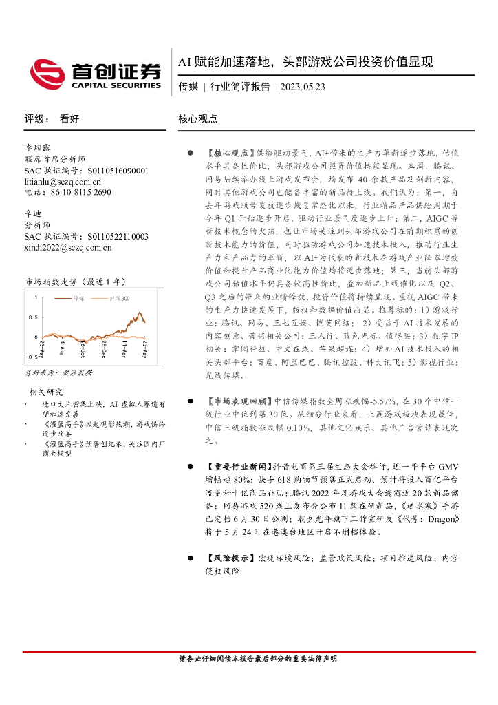 首创证券:传媒行业简评报告:AI赋能加速落地,头部游戏公司投资价值显现.pdf