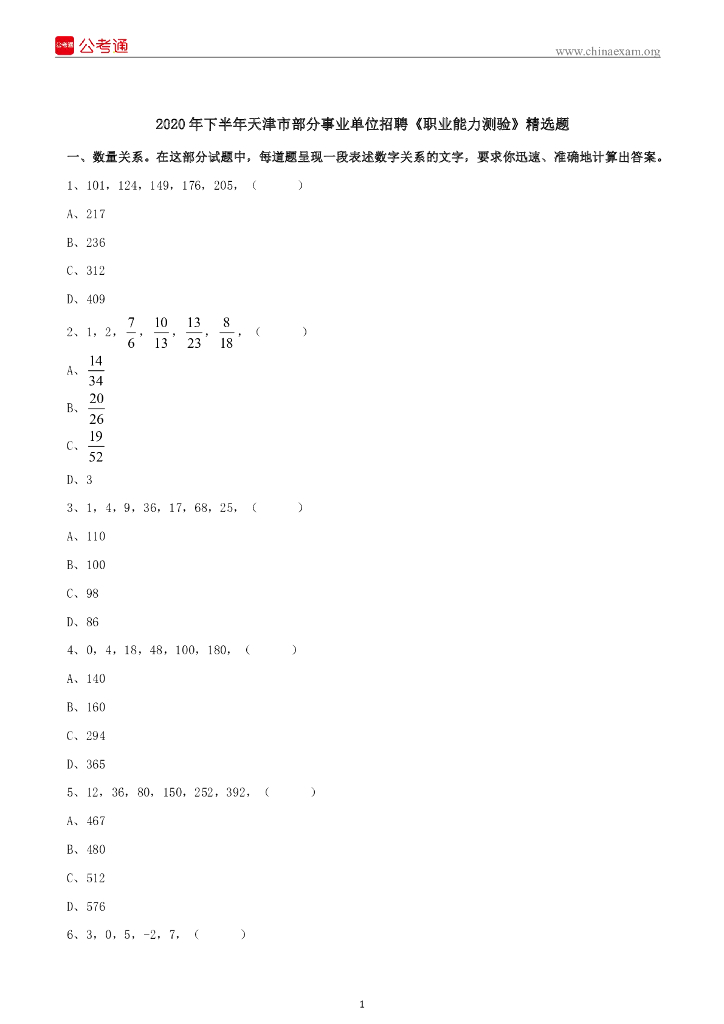 2020年下半年天津部分事业单位招聘《职业能力测验》精选题.pdf