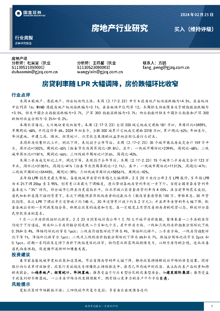 国金证券:房地产行业研究:房贷利率随LPR大幅调降,房价跌幅环比收窄.pdf