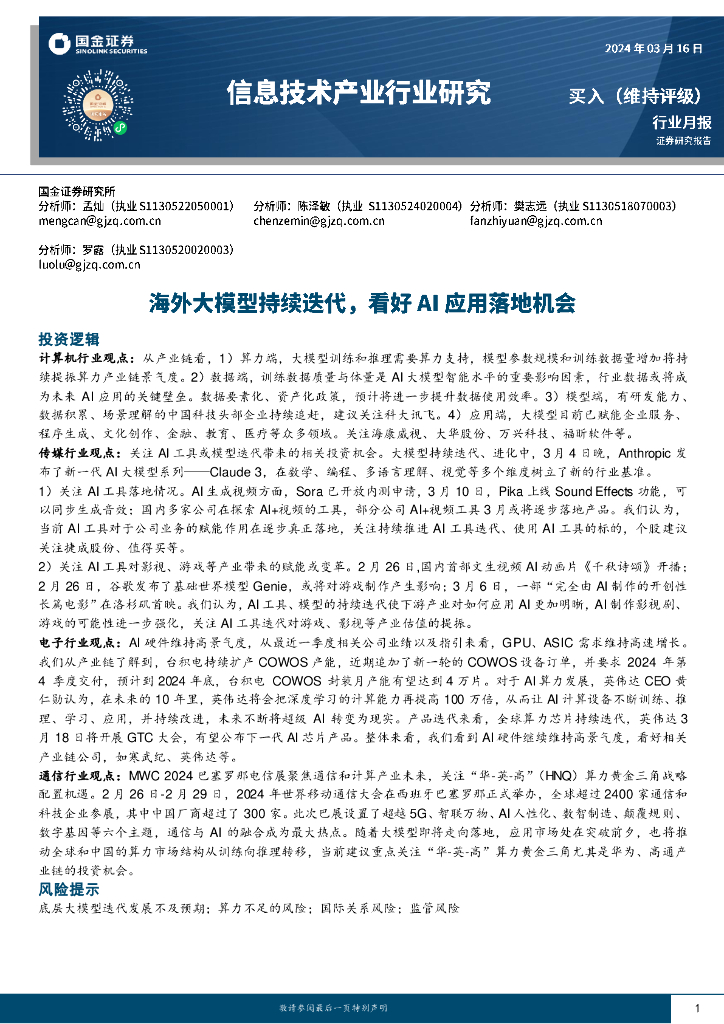 国金证券:信息技术产业行业研究:海外大模型持续迭代,看好AI应用落地机会.pdf