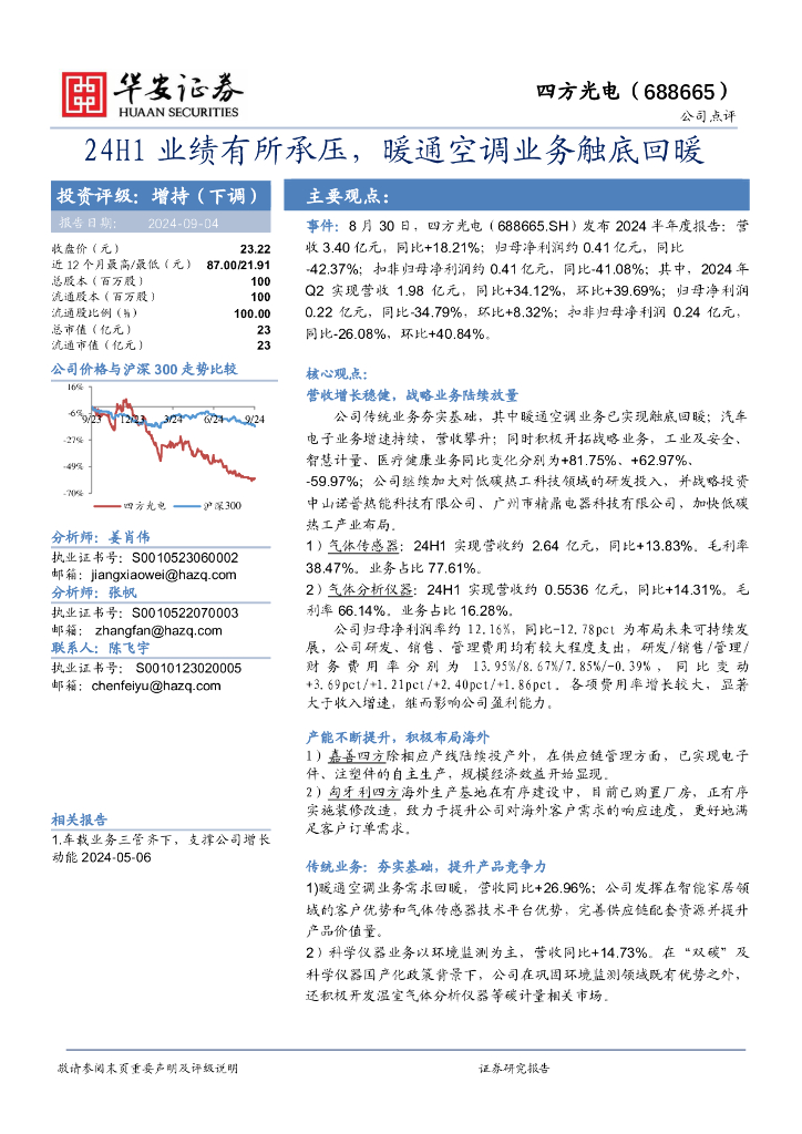 华安证券:四方光电(688665)-24H1业绩有所承压,暖通空调业务触底回暖.pdf