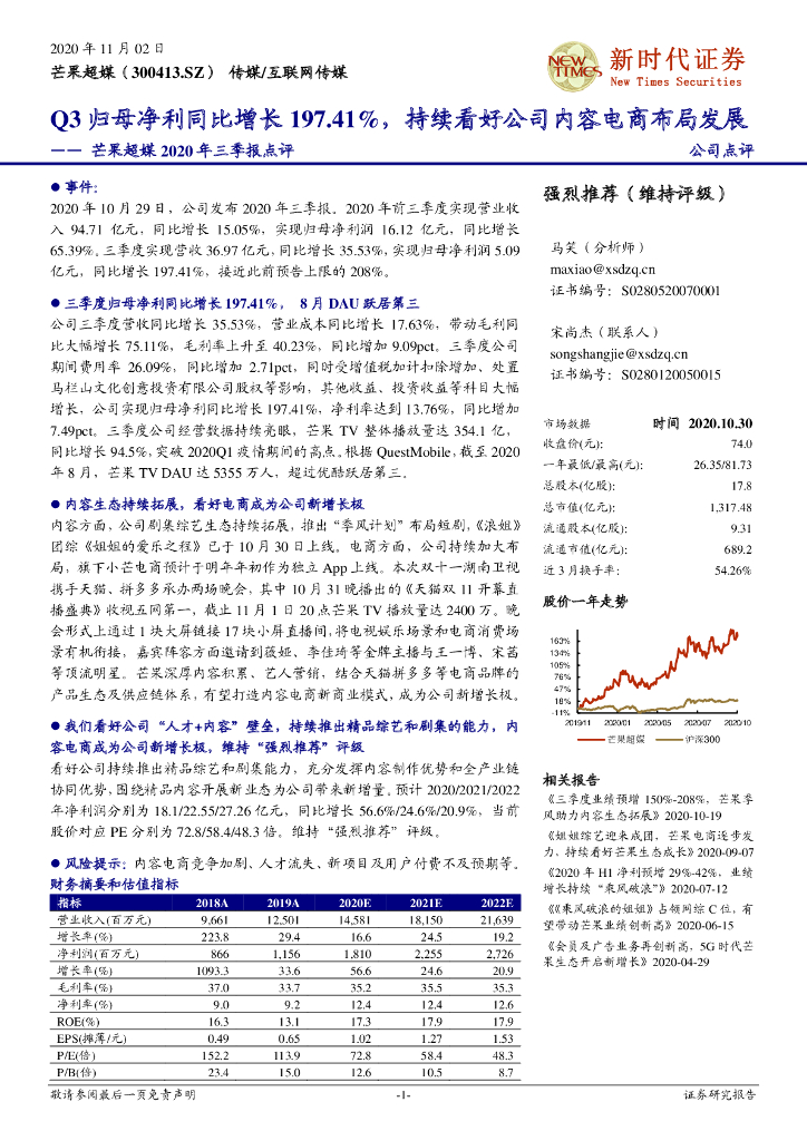 新时代证券:芒果超媒2020年三季报点评:Q3归母净利同比增长197.41%,持续看好公司内容电商布局发展.pdf