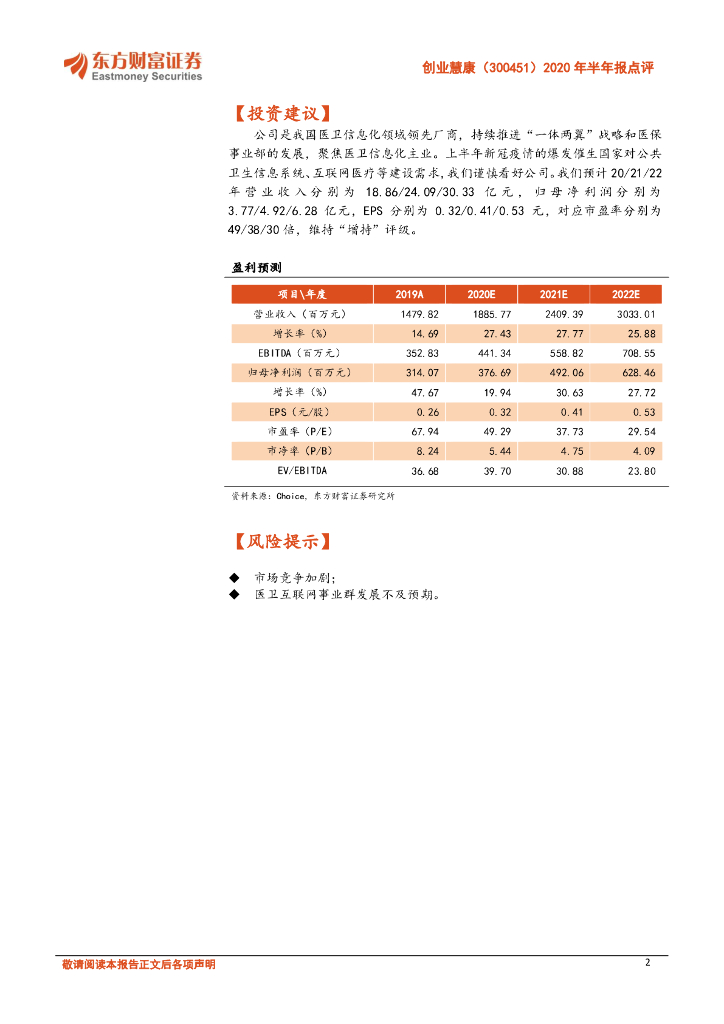 东方财富证券:创业慧康(300451)-2020年半年报点评:业绩回暖,深耕医卫信息化.pdf