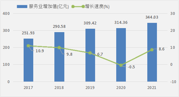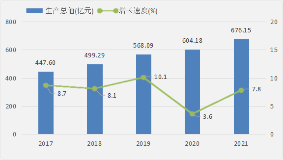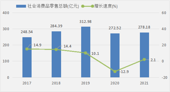 图8 2017--2021年社会消费品零售总额及其增长速度