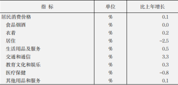 全年居民消费价格比上年上涨0.1%,其中食品价格下降1.4%。