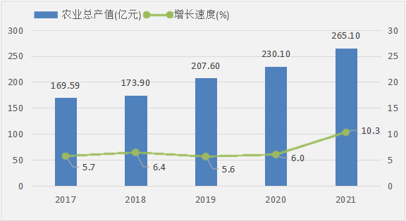 全年农、林、牧、渔业总产值2651010万元,比上年增长10.3%。其中,农业产值1575285万元,增长11.9%;林业产值677813万元,增长9.0%;畜牧业产值198810万元,增长3.5%;渔业产值129649万元,增长13.0%;农林牧渔服务业产值69453万元,增长9.4%。