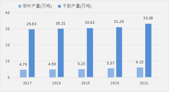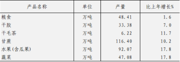 全年粮食、干胶、茶叶、甘蔗、水果(含瓜果)、蔬菜产量保持增长。