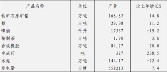 全年铁矿石原矿、糖、精制茶、中成药、合成橡胶、发电产量比上年增长,啤酒、水泥产量下降。