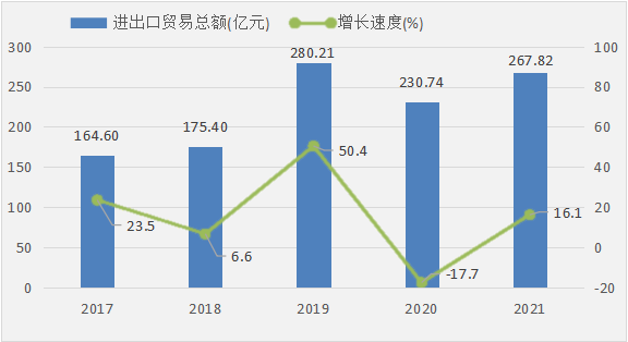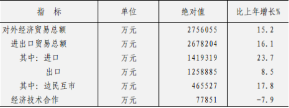 全年进出口贸易总额2678204万元,比上年增长16.1%。其中,进口1419319万元,增长23.7%;出口1258885万元,增长8.5%。