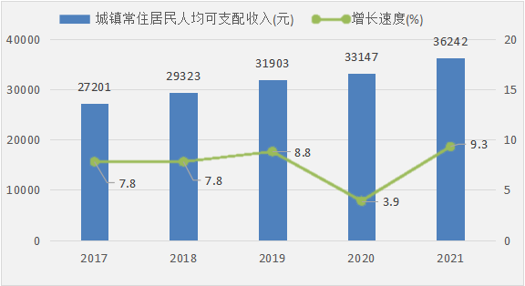 图15 2017--2021年城镇常住居民人均可支配收入及其增长速度