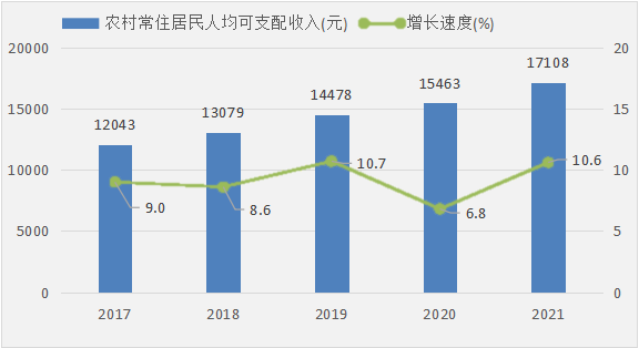 图16 2017--2021年农村常住居民人均可支配收入及其增长速度