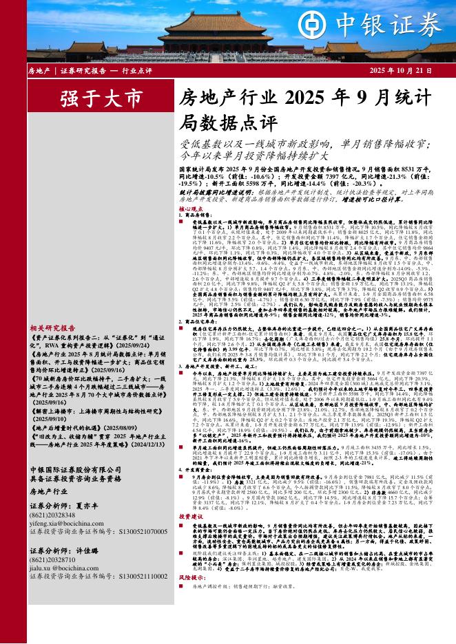 中银证券:房地产行业2025年9月统计局数据点评:受低基数以及一线城市新政影响,单月销售降幅收窄;今年以来单月投资降幅持续扩大.pdf