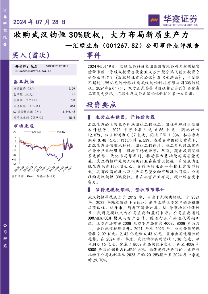 华鑫证券:汇绿生态(001267)-公司事件点评报告:收购武汉钧恒30%股权,大力布局新质生产力.pdf