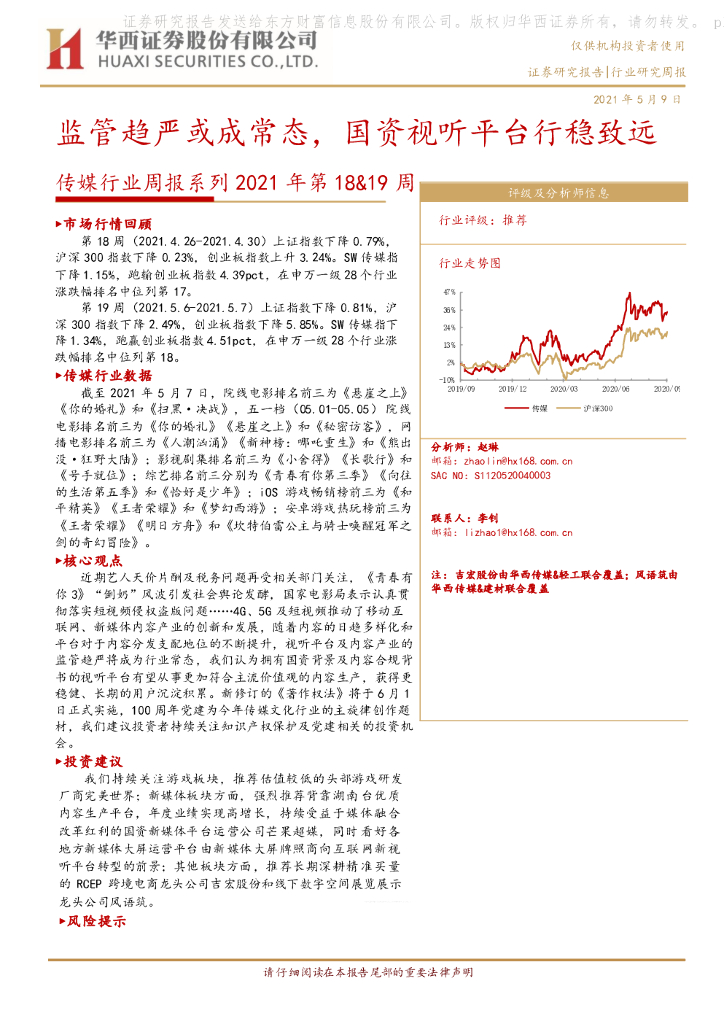华西证券:传媒行业周报系列2021年第18&19周:监管趋严或成常态,国资视听平台行稳致远.pdf