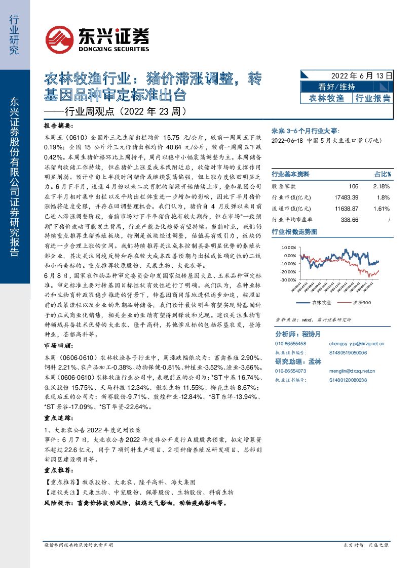 东兴证券:农林牧渔行业周观点(2022年23周):猪价滞涨调整,转基因品种审定标准出台.pdf