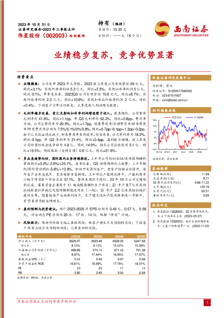 西南证券:伟星股份(002003)-2023年三季报点评:业绩稳步复苏,竞争优势显著.pdf