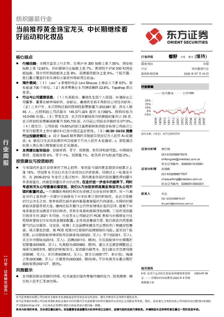 东方证券:纺织服装行业:当前推荐黄金珠宝龙头 中长期继续看好运动和化妆品.pdf