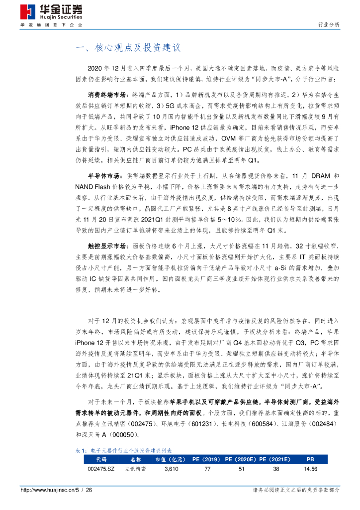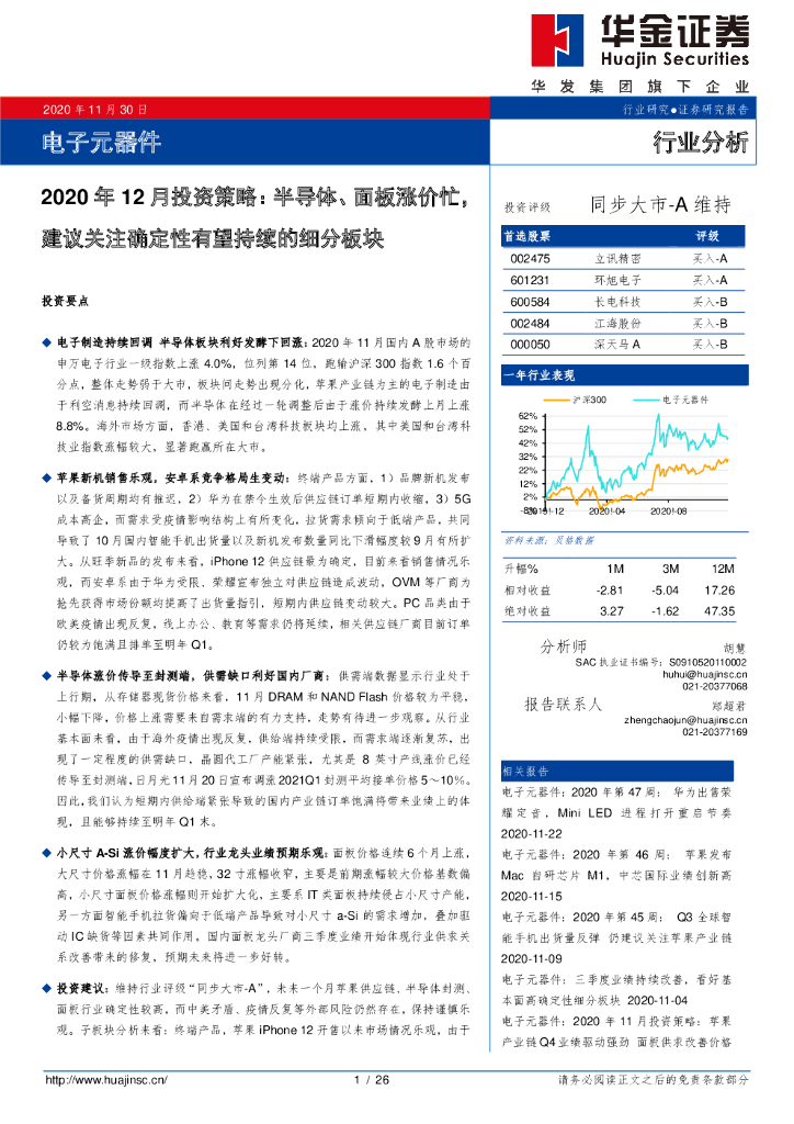 华金证券:电子元器件2020年12月投资策略:半导体、面板涨价忙,建议关注确定性有望持续的细分板块.pdf