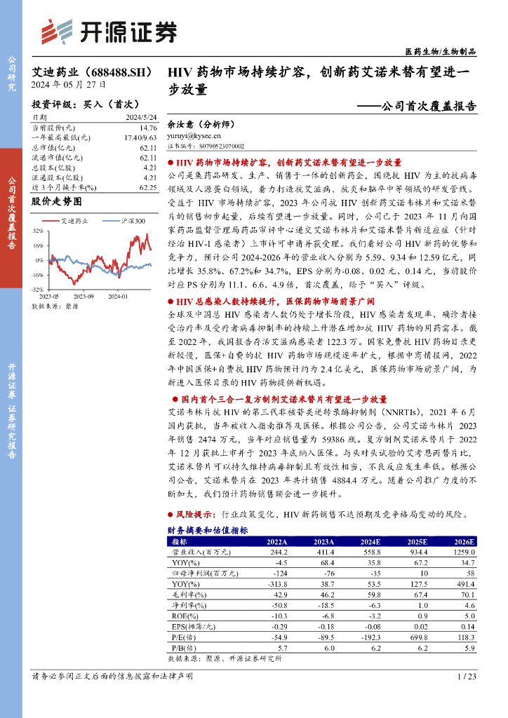 开源证券:艾迪药业(688488)-公司首次覆盖报告:HIV药物市场持续扩容,创新药艾诺米替有望进一步放量.pdf