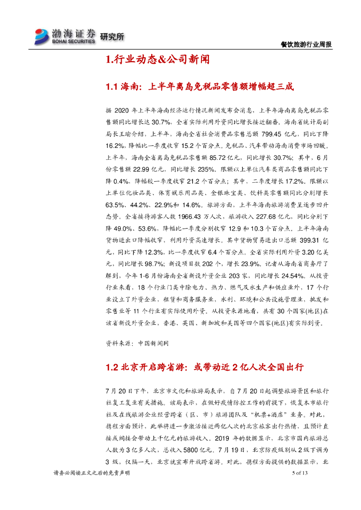 渤海证券:餐饮旅游行业周报:多地开启跨省团队游 离岛免税上半年增长超三成.pdf