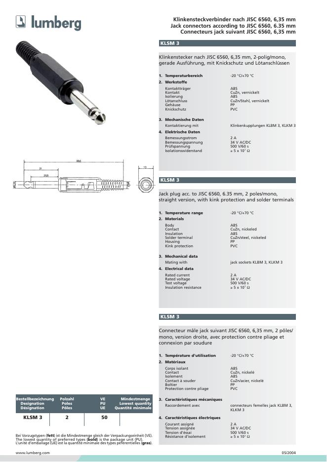 LUMBERG Klinkensteckverbinder nach JISC 6560, 6,35 mm Jack connectors according to JISC 6560, 6.35 mm Connecteurs jack suivant JISC 6560, 6,35 mm 数据手册(2).pdf