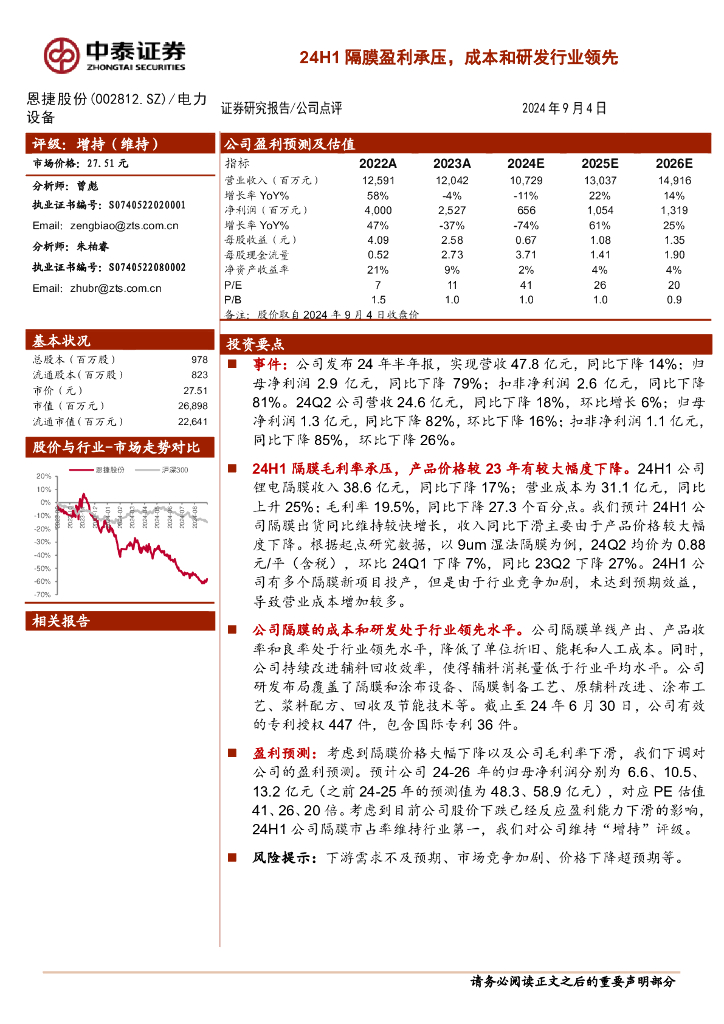 中泰证券:恩捷股份(002812)-24H1隔膜盈利承压,成本和研发行业领先.pdf
