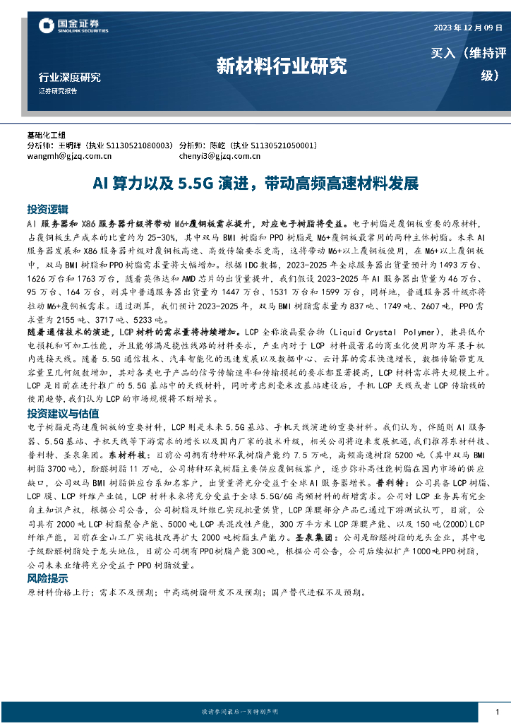国金证券:新材料行业研究:AI算力以及5.5G演进,带动高频高速材料发展.pdf