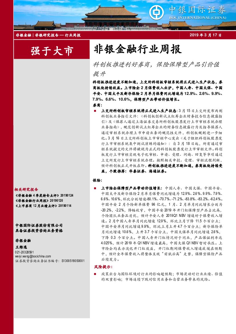 中银国际:非银金融行业周报:科创板推进利好券商,保险保障型产品引价值提升.pdf