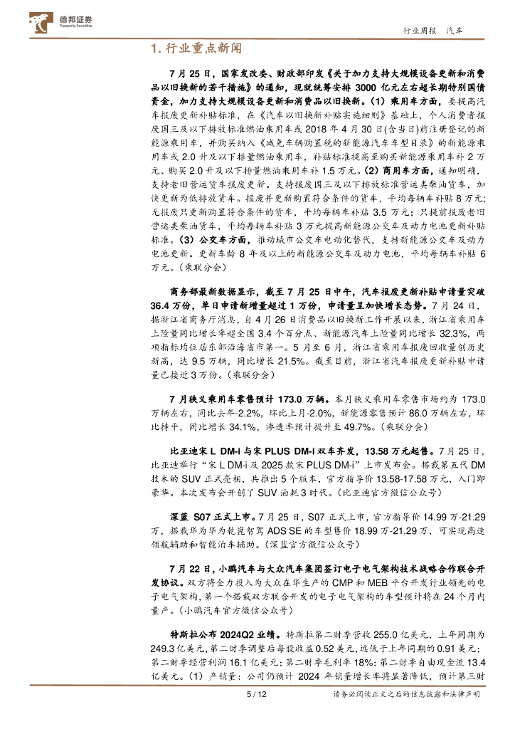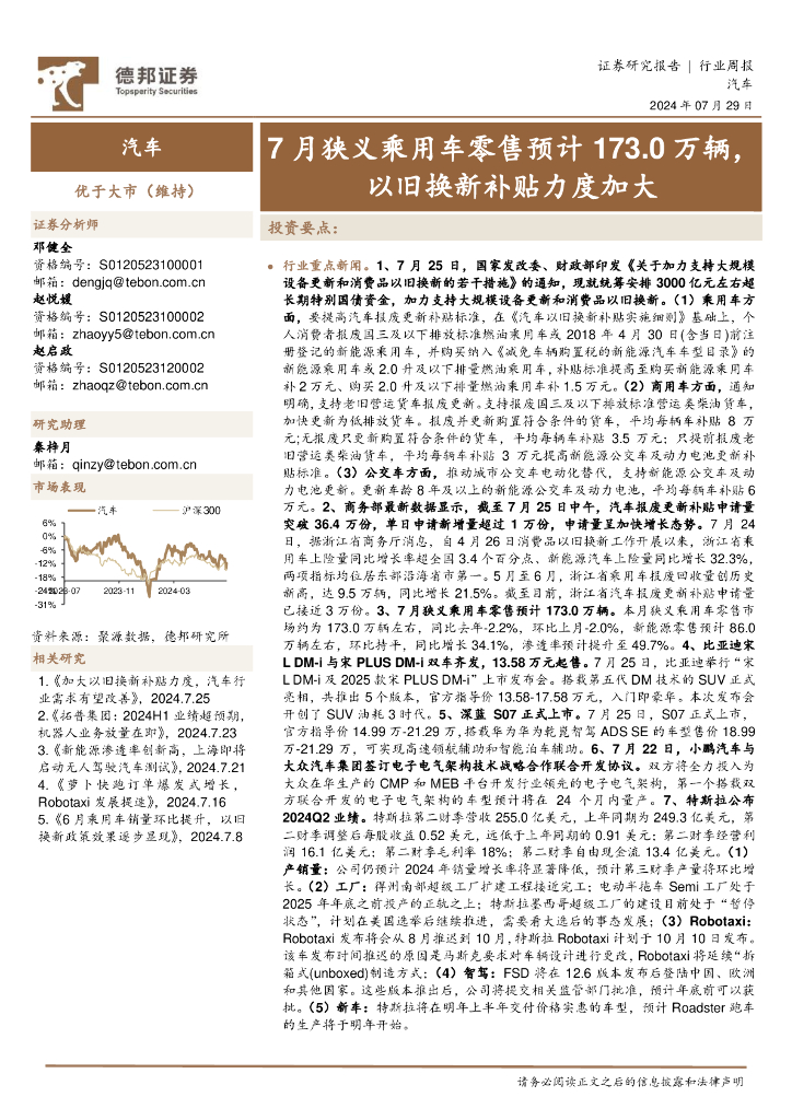 德邦证券:汽车行业周报:7月狭义乘用车零售预计173.0万辆,以旧换新补贴力度加大.pdf