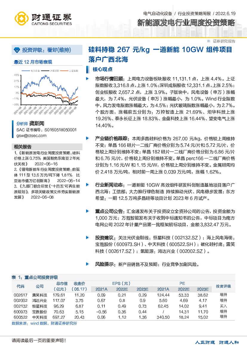 财通证券:新能源发电行业周度投资策略:硅料持稳267元/kg一道新能10GW组件项目落户广西北海.pdf