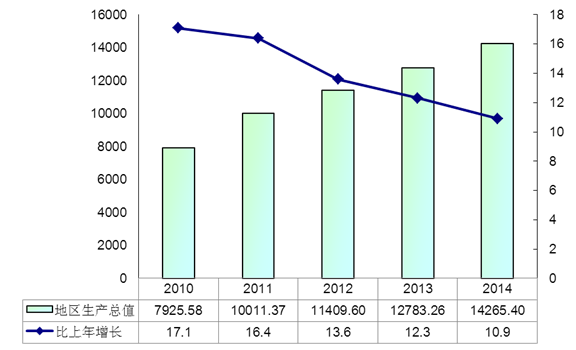 国民经济保持稳定增长。初步核算,全年实现地区生产总值14265.40亿元,比上年增长10.9%。其中,第一产业增加值1061.03亿元,增长4.4%;第二产业增加值6531.86亿元,增长12.7%;第三产业增加值6672.51亿元,增长10.0%。三次产业结构比为7.4∶45.8∶46.8。非公有制经济实现增加值8750.14亿元,增长11.1%,占全市经济的61.3%。按常住人口计算,全市人均地区生产总值达到47859元(7791美元),比上年增长10.0%。
