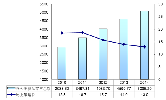 消费品市场增长平稳。全年实现社会消费品零售总额5096.20亿元,比上年增长13.0%,扣除价格因素,实际增长12.0%。按经营地统计,城镇消费品零售额4838.22亿元,增长12.9%;乡村消费品零售额257.98亿元,增长14.8%;按行业统计,批发和零售业零售额4339.43亿元,增长12.9%;住宿和餐饮业零售额756.77亿元,增长13.4%。