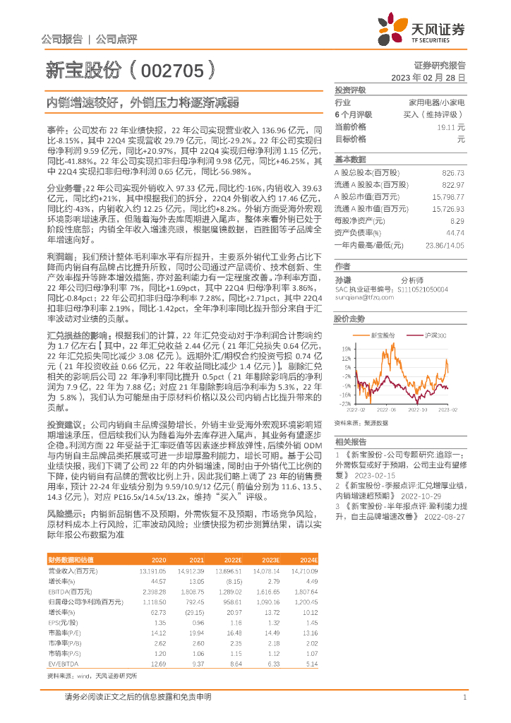 天风证券:新宝股份(002705)-内销增速较好,外销压力将逐渐减弱.pdf