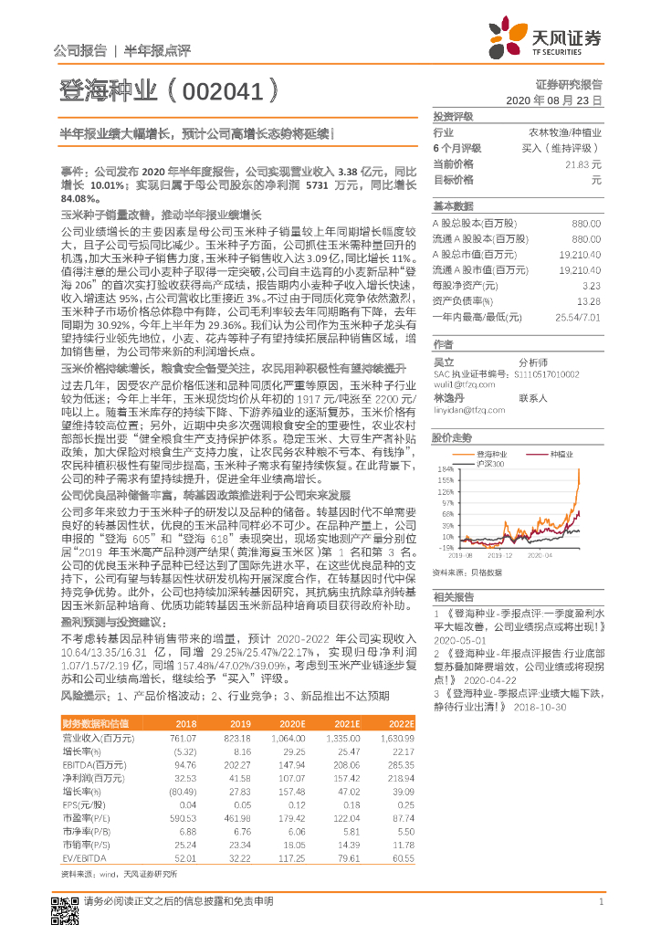天风证券:登海种业(002041)-半年报业绩大幅增长,预计公司高增长态势将延续!.pdf