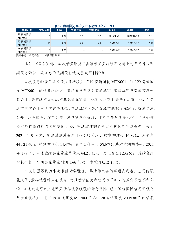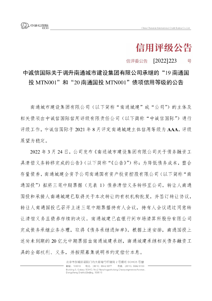 中诚信:中诚信国际关于调升南通城市建设集团有限公司承继的“19南通国投MTN001”和“20南通国投MTN001”债项信用等级的公告.pdf