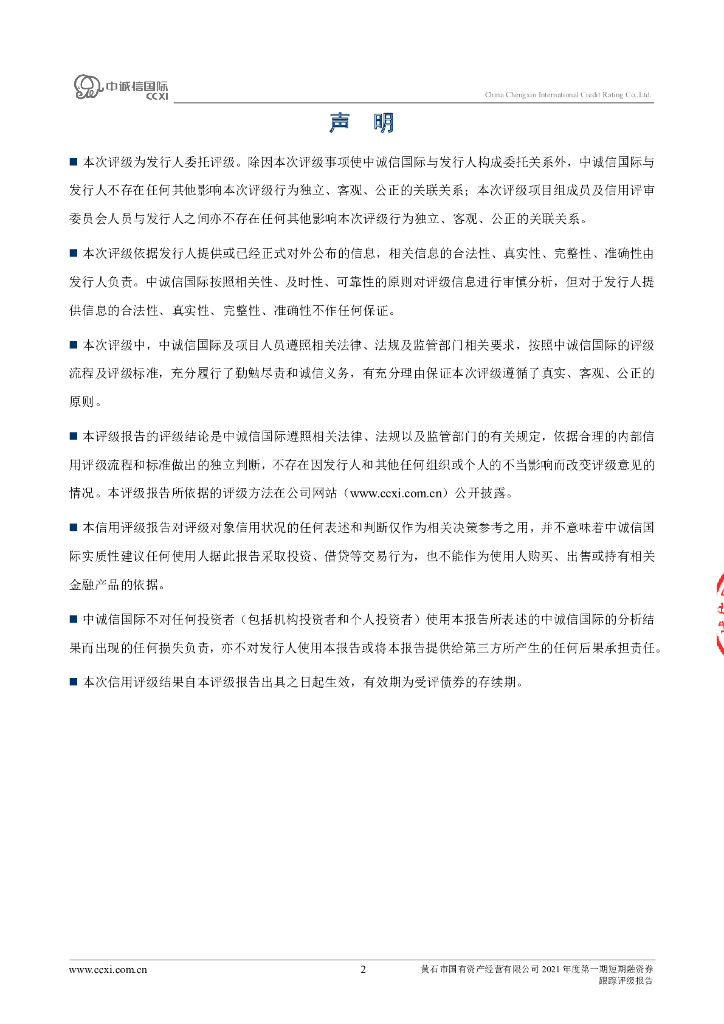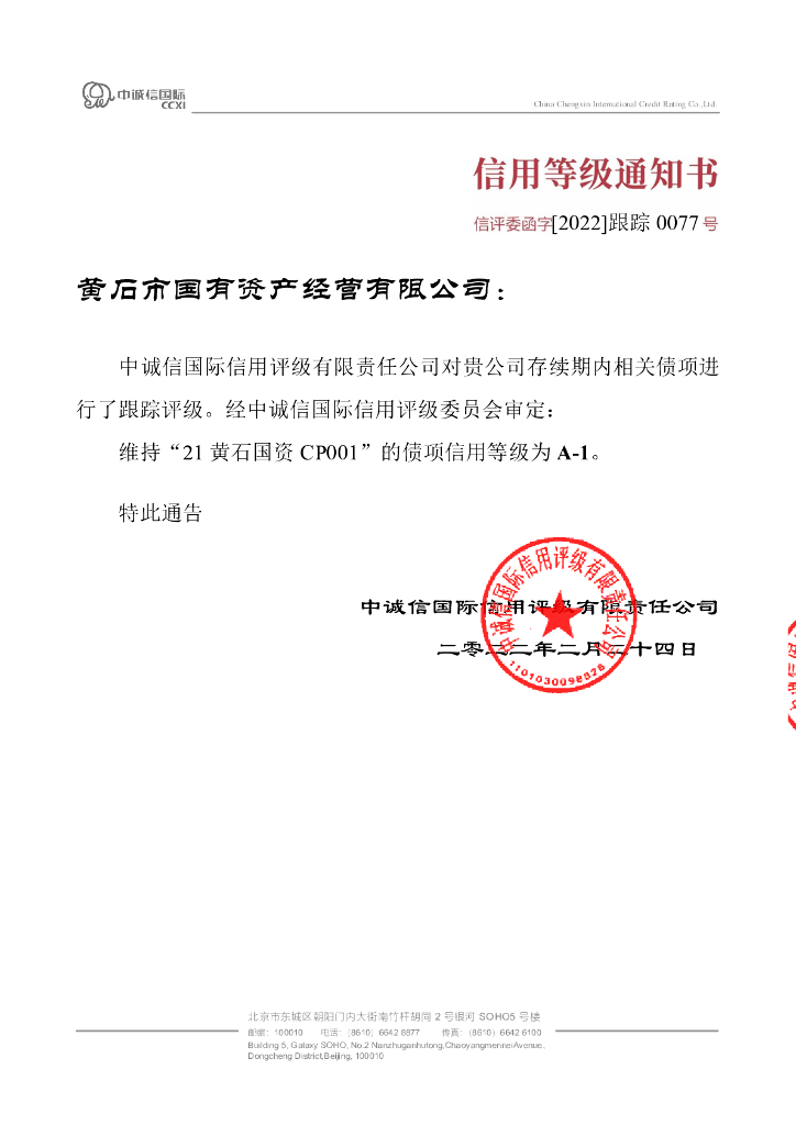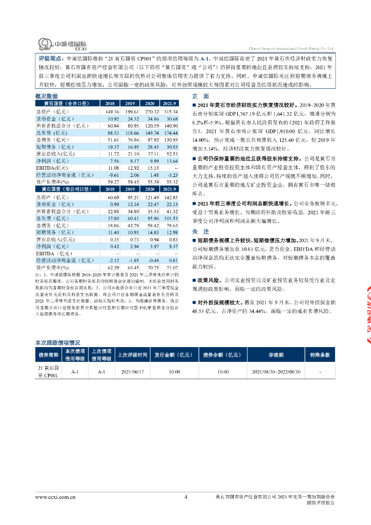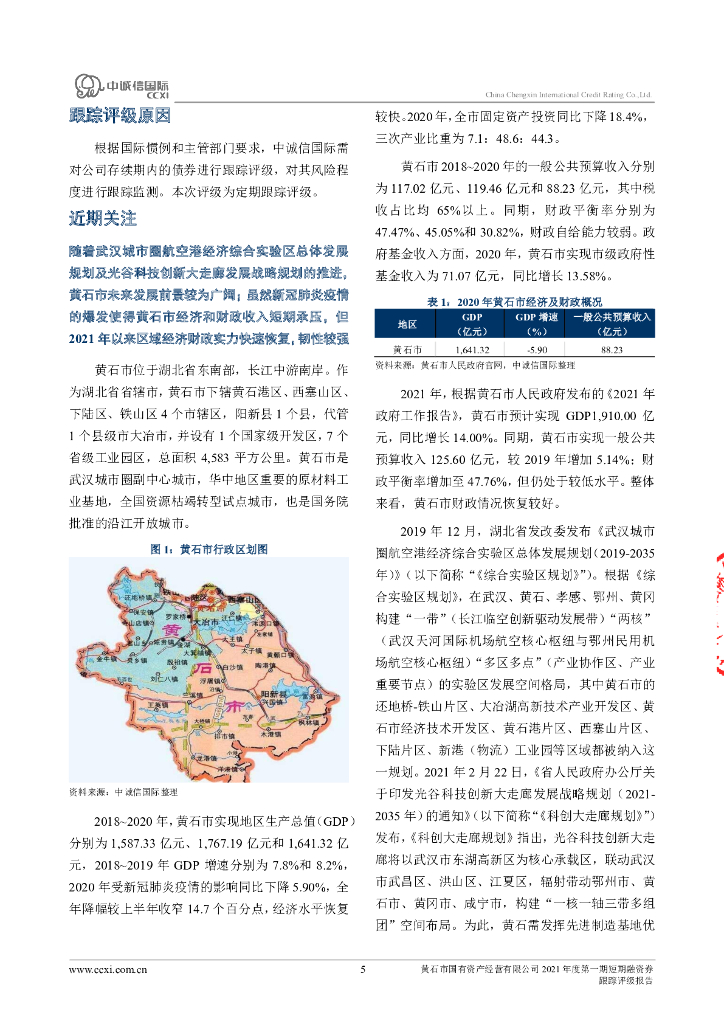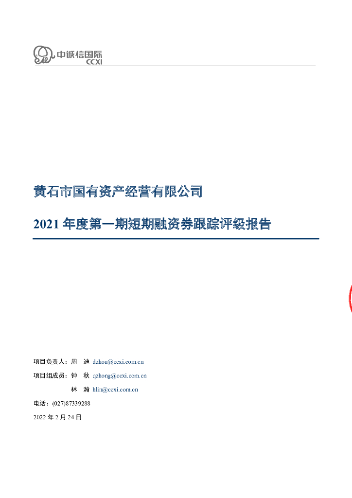 中诚信:黄石市国有资产经营有限公司2021年度第一期短期融资券跟踪评级报告.pdf