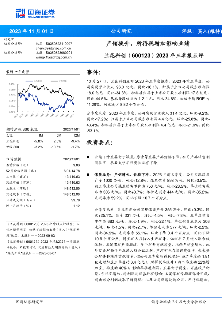 国海证券:兰花科创(600123)-2023年三季报点评:产销提升,所得税增加影响业绩.pdf