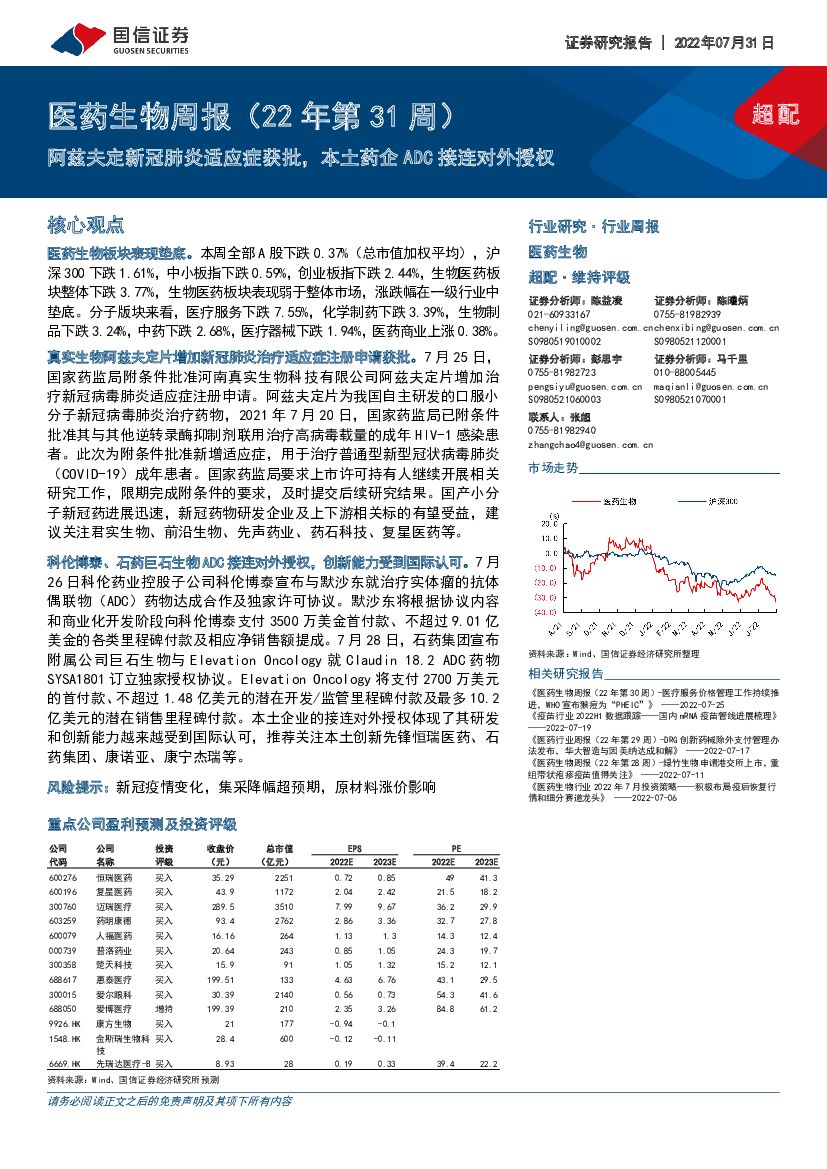 国信证券:医药生物周报(22年第31周):阿兹夫定新冠肺炎适应症获批,本土药企ADC接连对外授权.pdf