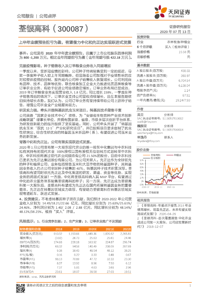 天风证券:荃银高科(300087)-上半年业绩预告扭亏为盈,有望借力中化和先正达实现跃进式发展.pdf