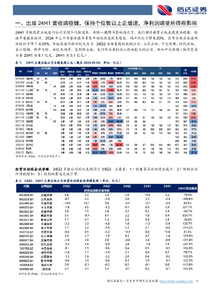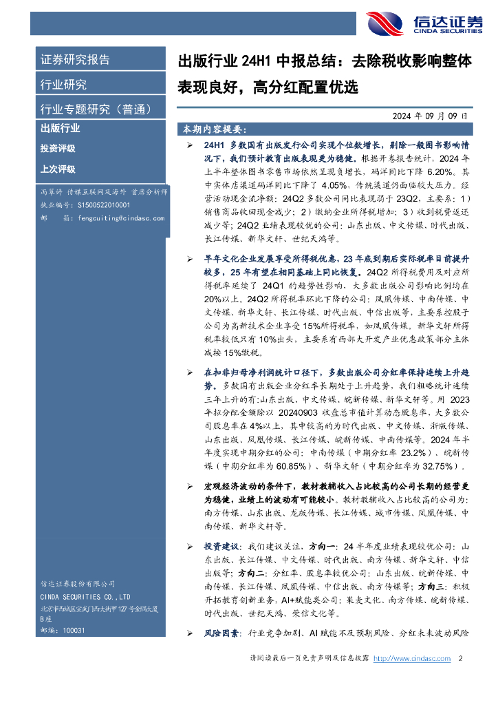 信达证券:出版行业24H1中报总结:去除税收影响整体表现良好,高分红配置优选.pdf
