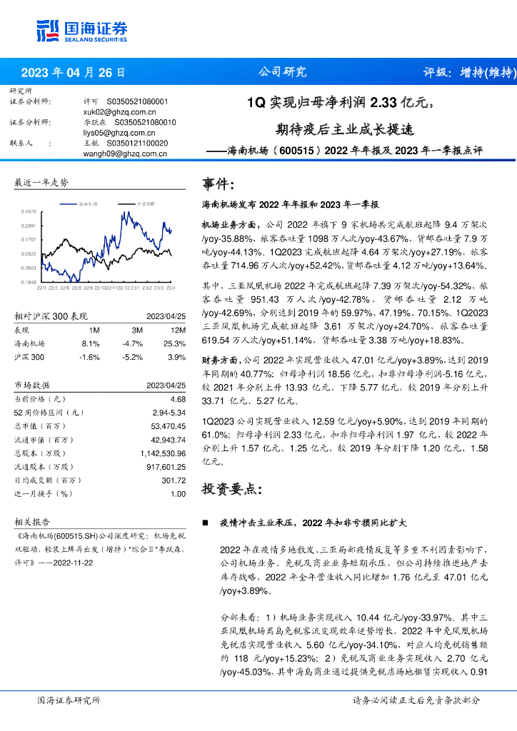 国海证券:海南机场(600515)-2022年年报及2023年一季报点评:1Q实现归母净利润2.33亿元,期待疫后主业成长提速.pdf