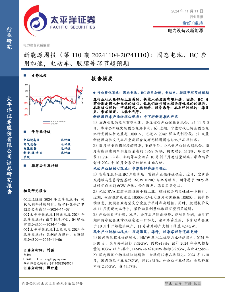 太平洋证券:电力设备及新能源行业新能源周报:固态电池、BC应用加速,电动车、胶膜等环节超预期.pdf
